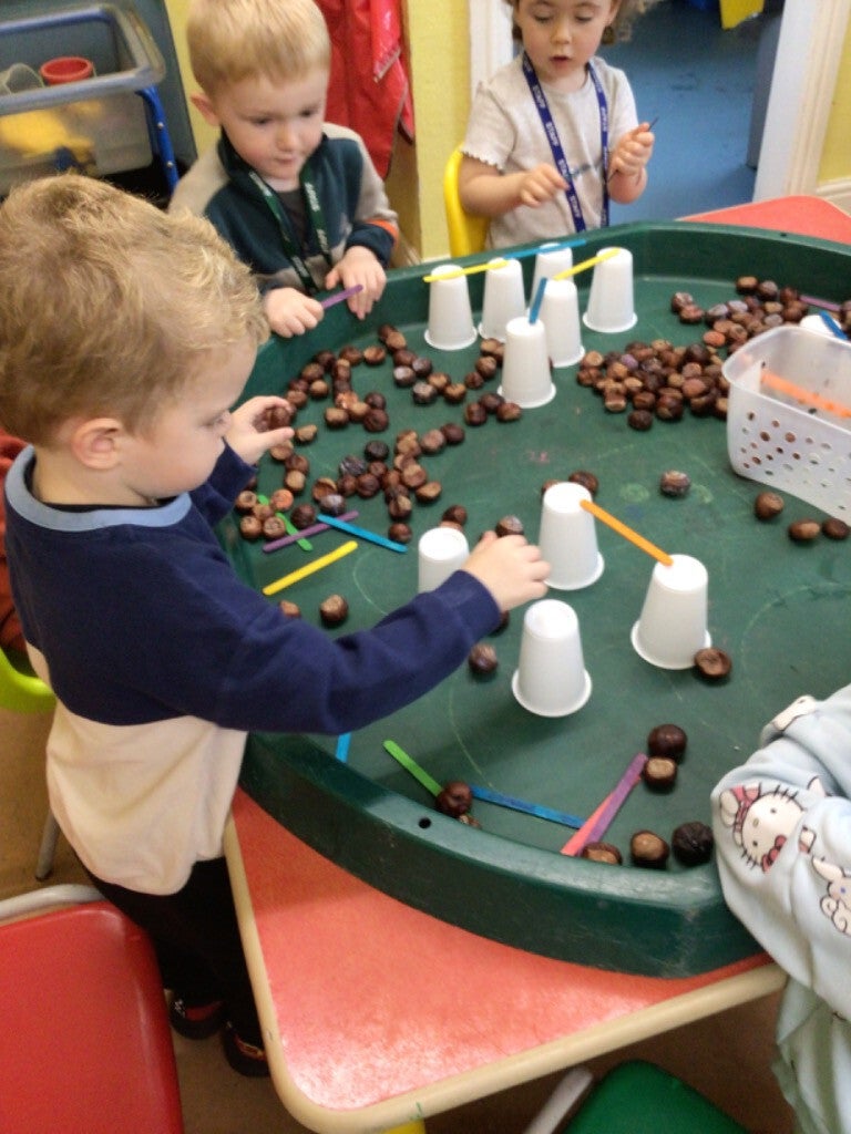 We learn to explore and engage through gestures, gaze and talk. We learn to take turns, share, learn rules and we learn new language. We count objects and use lots of mathematical language, tiny, big, huge, heavy, light, below, full empty. We estimate how many more spadefuls before the bucket is full. We use our hands to squeeze, hold, dig, scoop etc.this prepares us for later writing skills. We use our imagination and act out things we see in the world around us.
