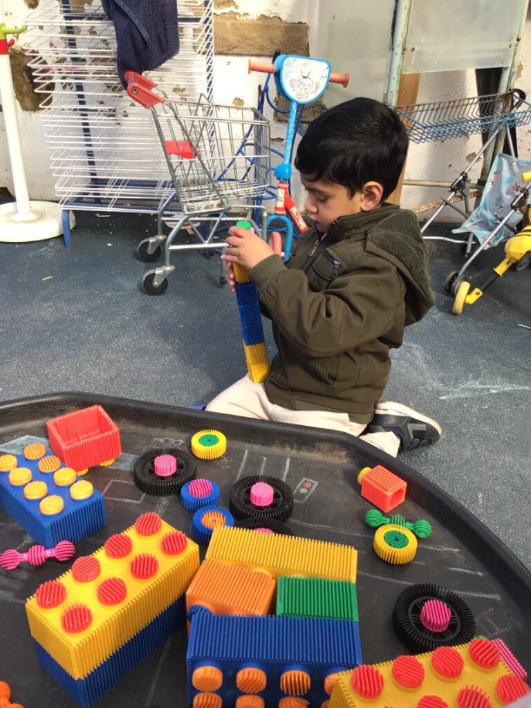Children have the opportunity to construct and deconstruct a range of structures. They can count, expore length, height and area and investigate and solve problems. They can work collaboratively with others to build imaginatively and use experiences from home and in the world around them.The children will use their imagination to plan, extend and modify an activity. They develop lots of language skills for example push, fix, balance, fall, stack, build, slot, topple, connect. We use lots of mathematical language, counting, big little, small square cube, longer, wider etc.