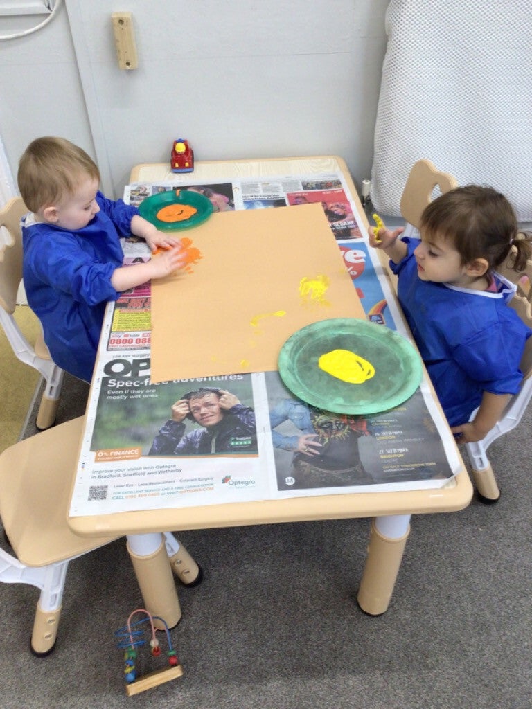 We have spatualas, scissors, brushes, powder paint, ready mix paint, glue and a variety of materials i.e ribbon, string, glitter, etc. We add natural material e..g. gravel, leaves, sticks etc. We have recycled materials for children to model make such as yoghurt pots and different size boxes. We have felt tips, pencils,(including skin tone pencils), crayons and chalk. We have aprons and a drying rack, different sized paper, magazines and catalgogues, an easil and a place for children to display their work.
