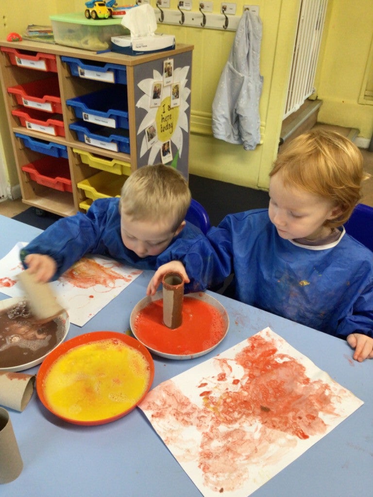We use lots of language in this area, e.g. light, dark, drip, mix, stick and mathematical language such as long, short, circle, pattern etc... Children use theiir imagination. They put random marks on paper and stick materials with glue whilst exploring space of the paper. They mix colours, join materials together, learn to use scissors safely, compare materials and represent people, nature and experiences.