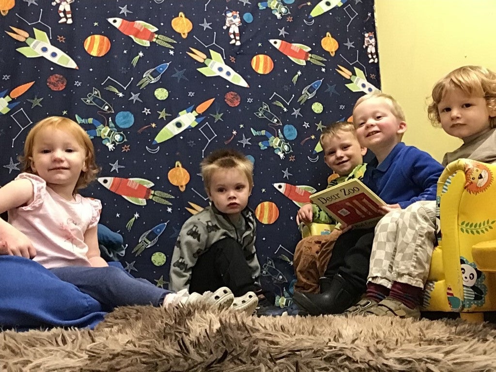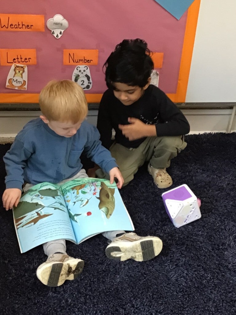 Our book areas have soft and comfortable seating where adults can also sit to share stories with the children, in groups and one to one. Children learn to look after books,turn pages and know when the book is the right way round. The learn where the beginning and end is. They learn new words, for example the author writes the story and an illustrater draws the pictures. We use puppets and wooden spoons so that the children can join in whilst an adult reads the story. The children sometimes act out the story, taking on individual parts. Children use pictures in the book to practice re-call and to re-tell the story. Children begin to have favourite stories and books.